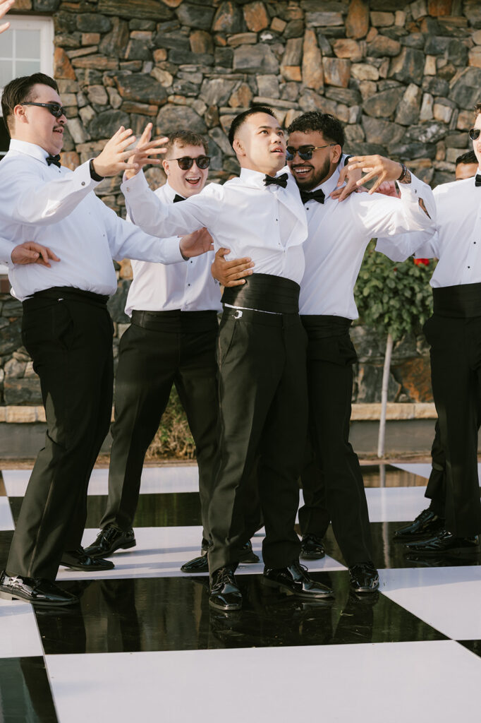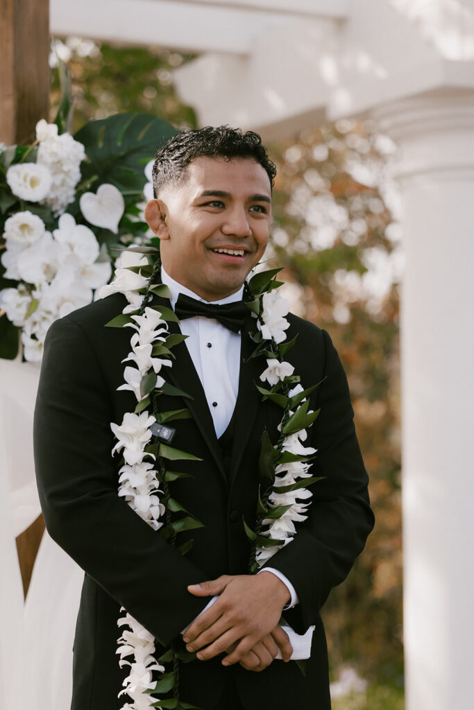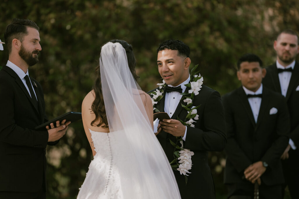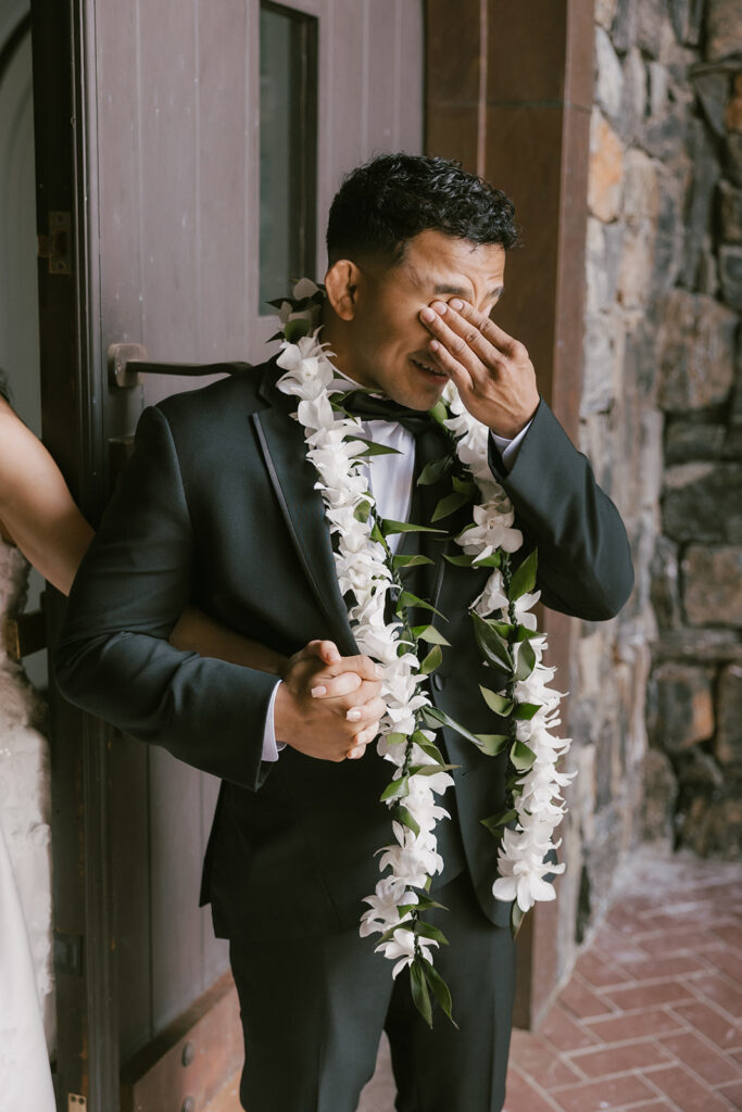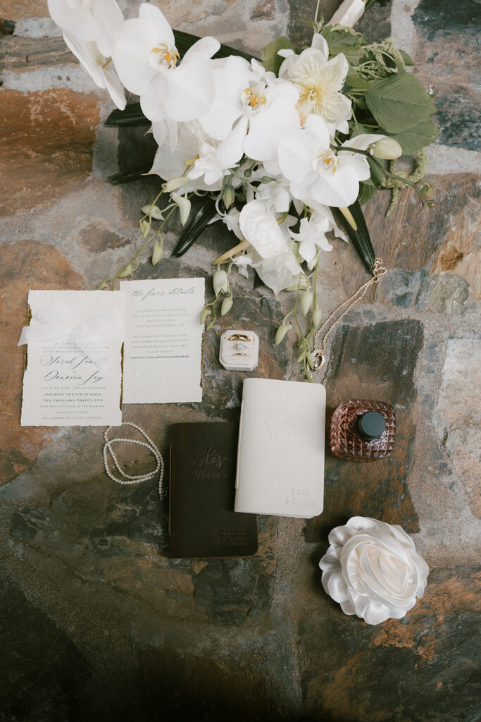 The ceremony took place in the heart of the courtyard, surrounded by towering stone walls that made the moment feel both private and monumental. Donovin’s reaction as he saw Sarah walk down the aisle was one of those genuine, tear-filled expressions that makes us so thankful for our work — the kind of raw emotion that still gives us goosebumps during editing.
