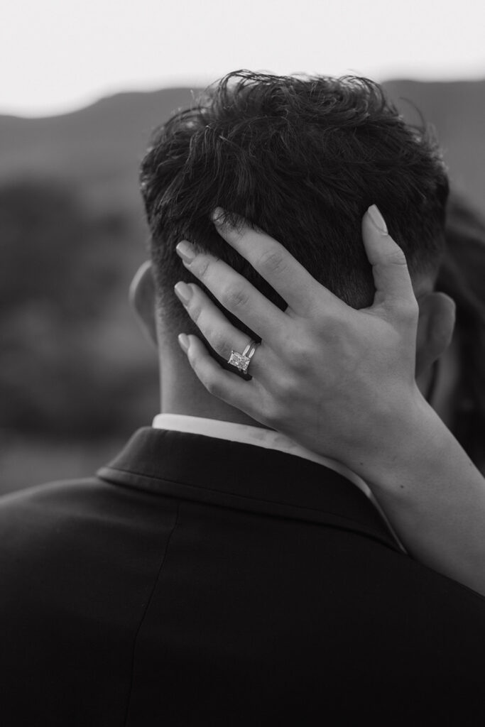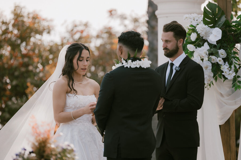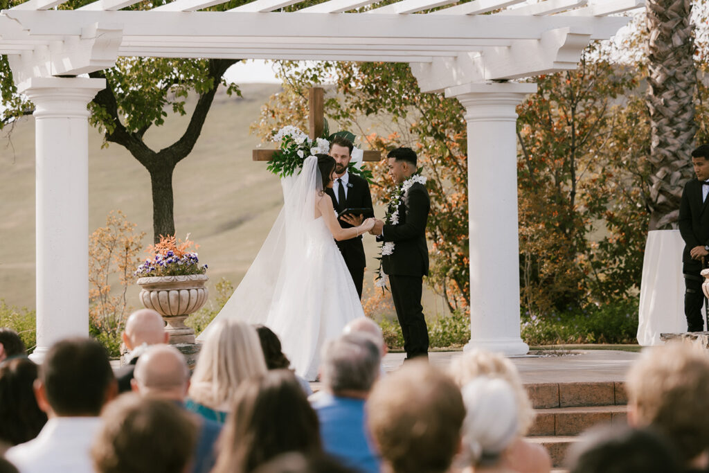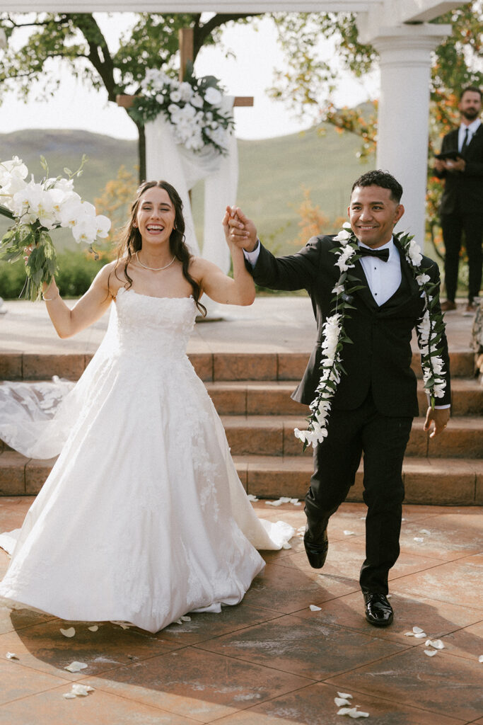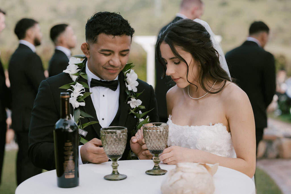 Outside, guests were greeted by panoramic valley views and the distant hum of live acoustic music echoing through the courtyard. Every detail — from the floral arch framed by climbing ivy to the vintage-inspired table settings — reflected Sarah and Donovin’s timeless, European-inspired vision.
